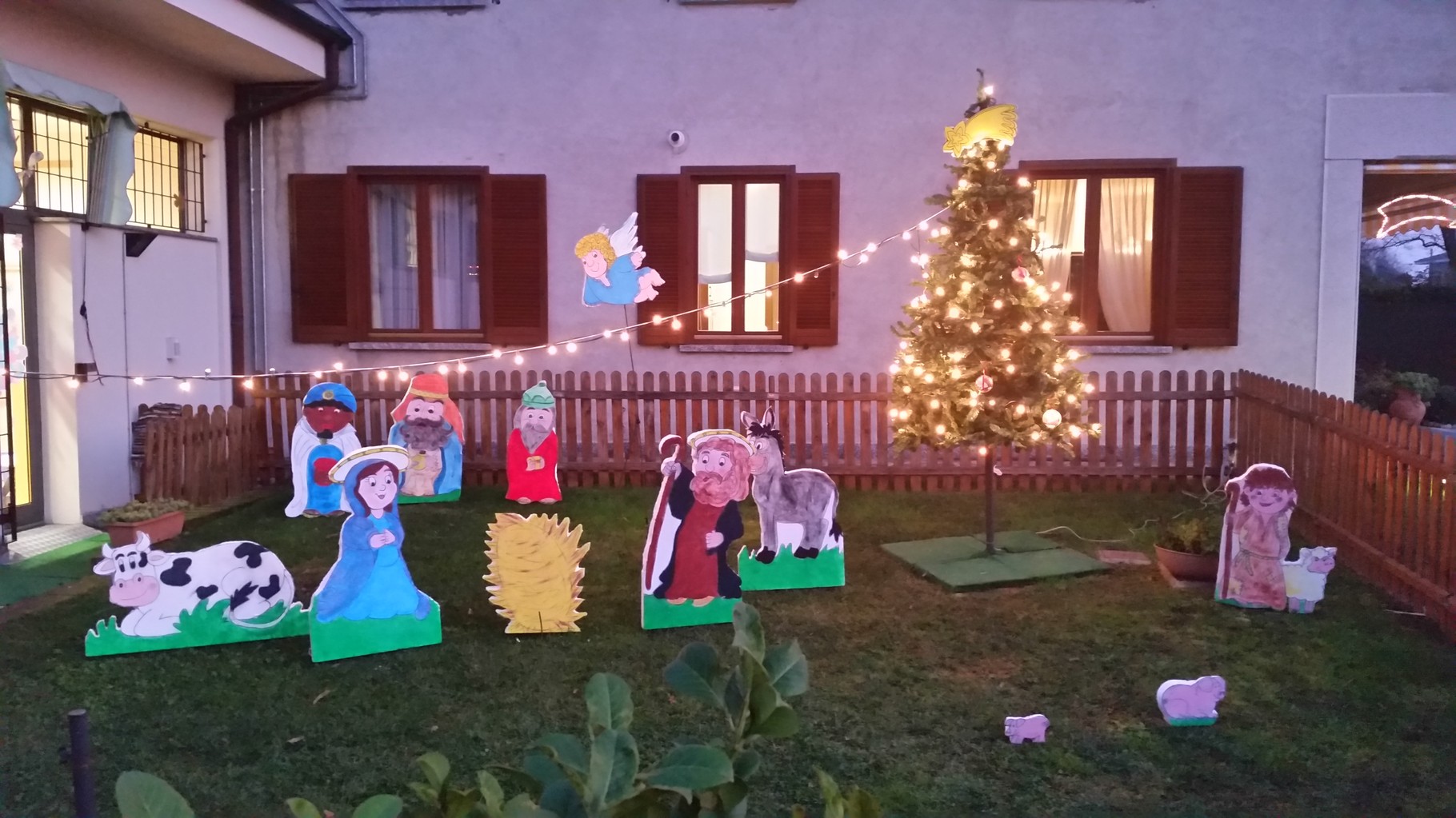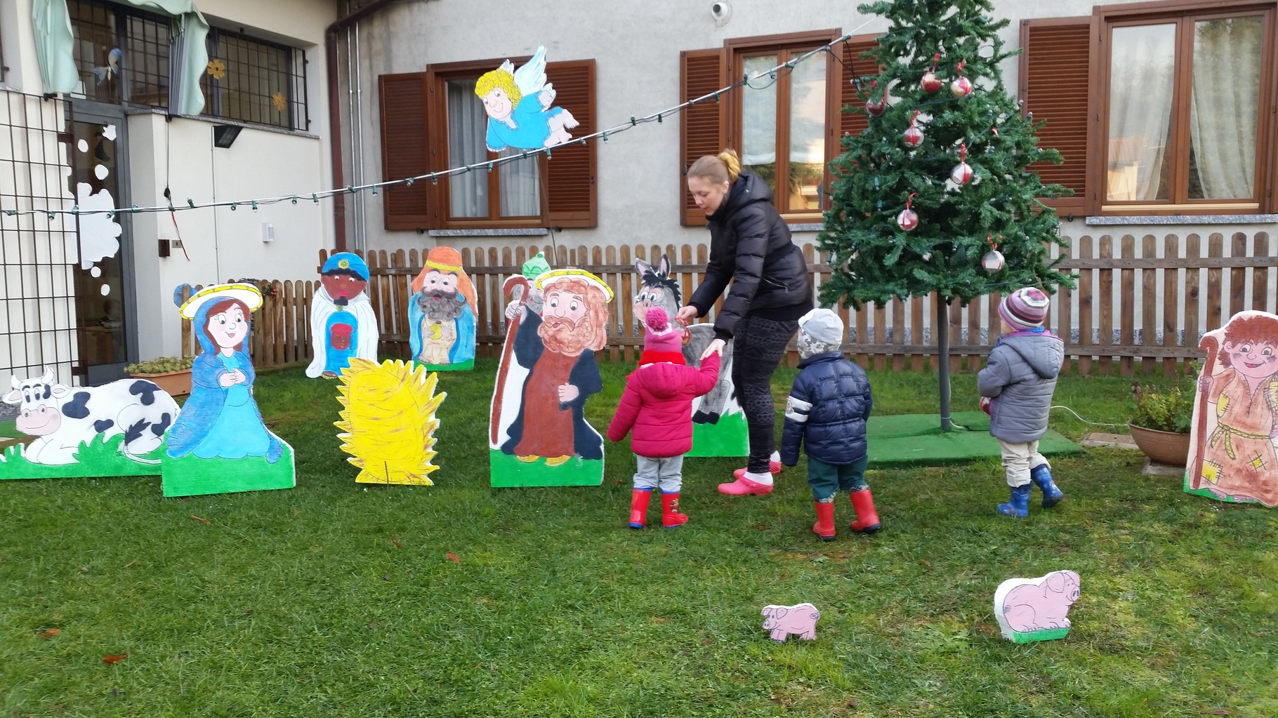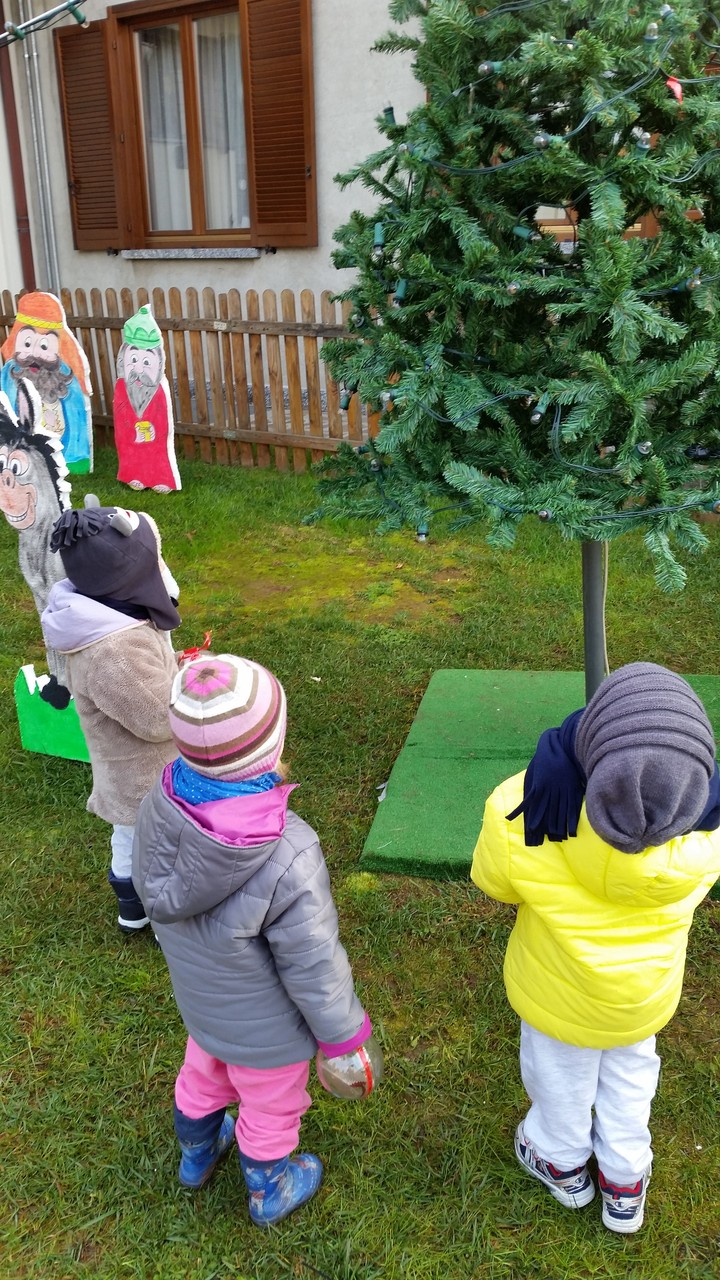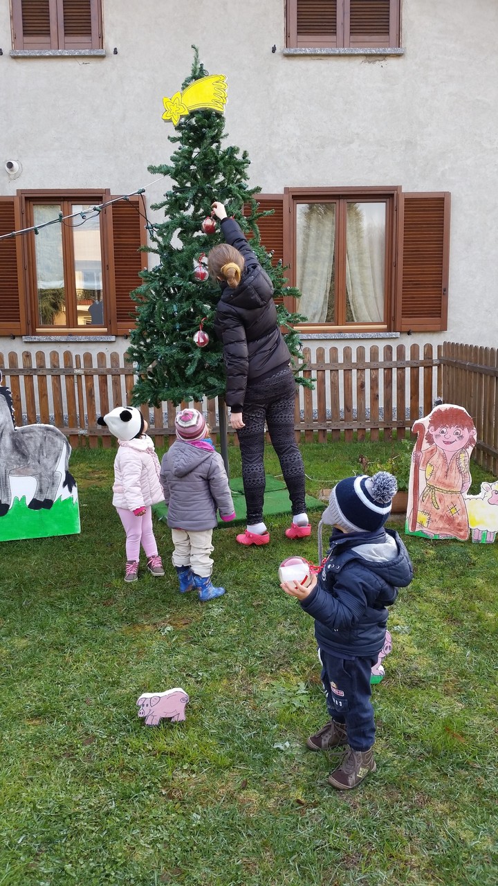L'ALBERO DI NATALE ADDOBBATO DAI BIMBI  E IL PRESEPE NELL'AREA VERDE DEL NIDO